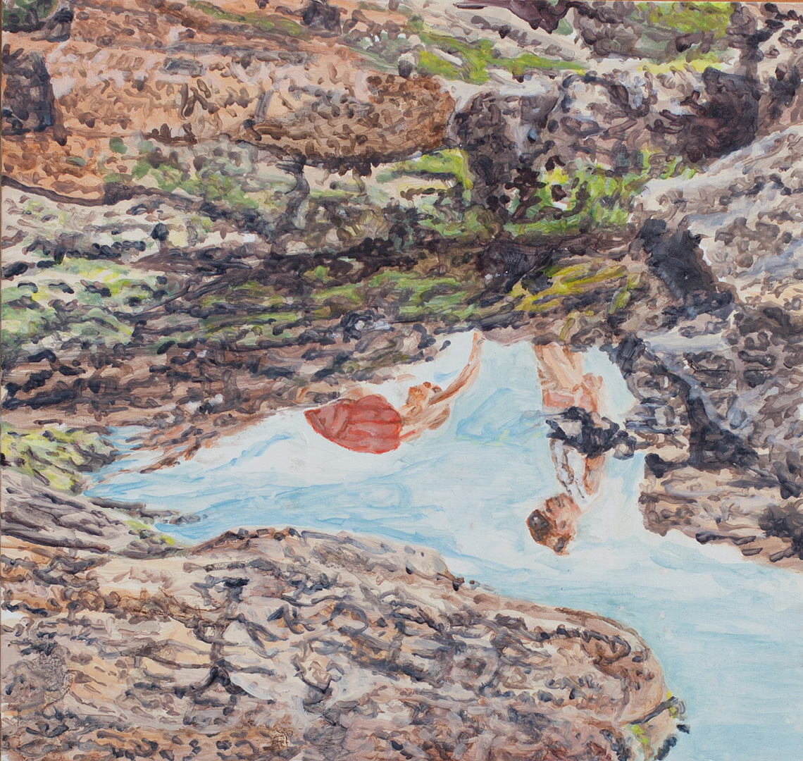 partie de pèche dans les rochers entre un frère et une sœur. Leur attitude s’oppose : alors que le garçon fouille obnubilé .La jeune femme, elle, semble être complétement absorbée par les rochers où serais-ce le contraire ?